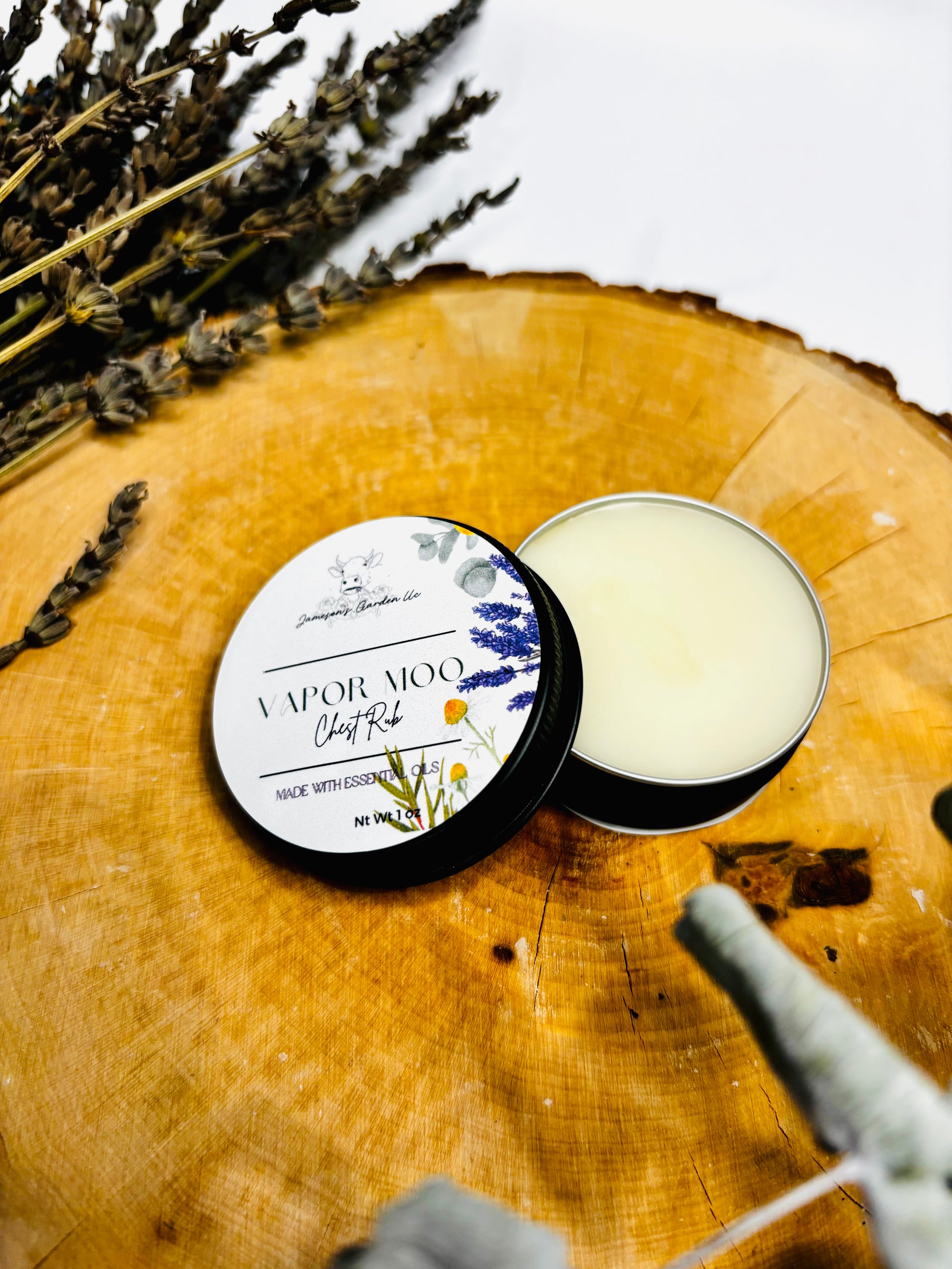 Vapor Moo Chest Rub helps with chest congestion. Made with all natural ingredients, including grass fed beef tallow, castor oil, and essential oils. Soothes and relieves discomfort for a more comfortable breathing experience. This is a nourishing blend of oils that absorb into skin without a sticky texture.